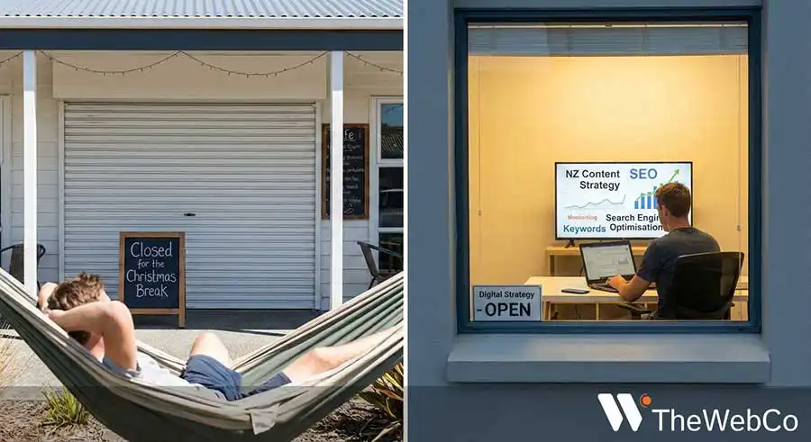This gap between the way New Zealand slows down and the way online behaviour accelerates has become more noticeable each year. The WebCo sees this across a wide range of clients, from sole traders to national organisations. Many assume the summer break is a time to step away from all digital tasks. In reality, it is one of the strongest periods for preparing content, updating websites, strengthening SEO, and putting a digital plan in place for the year ahead. It is also the ideal time to think about how Kiwi businesses can get ahead on SEO during the holidays and whether it is worth creating content while New Zealand is on holiday. The answer is yes.